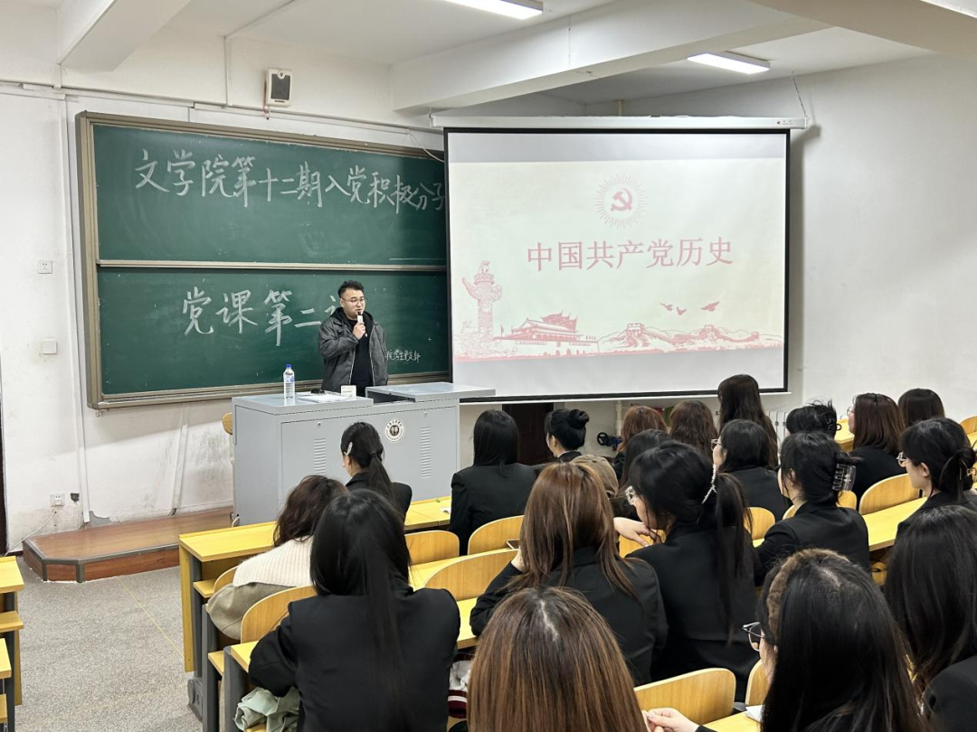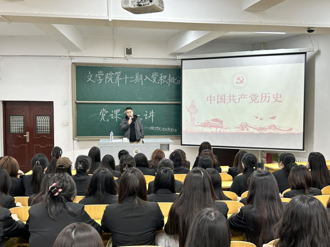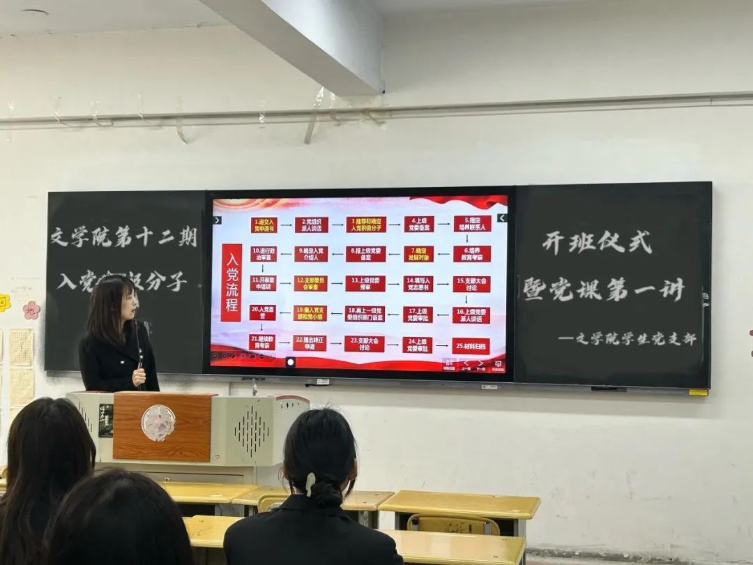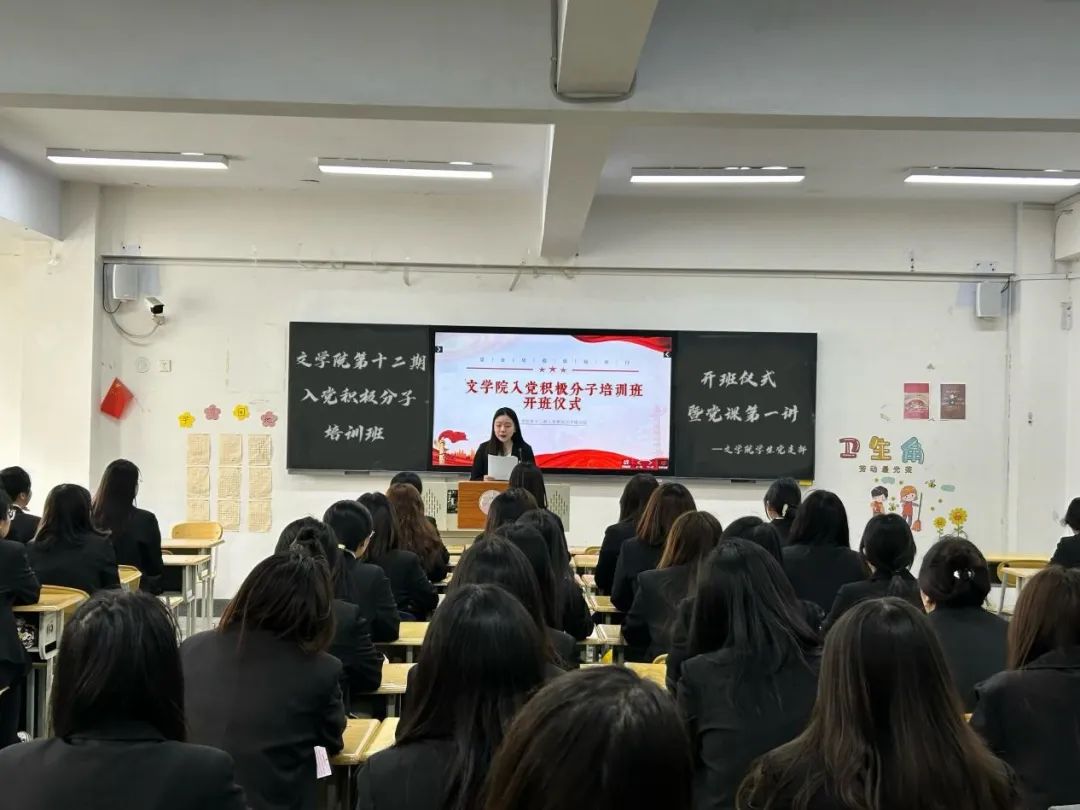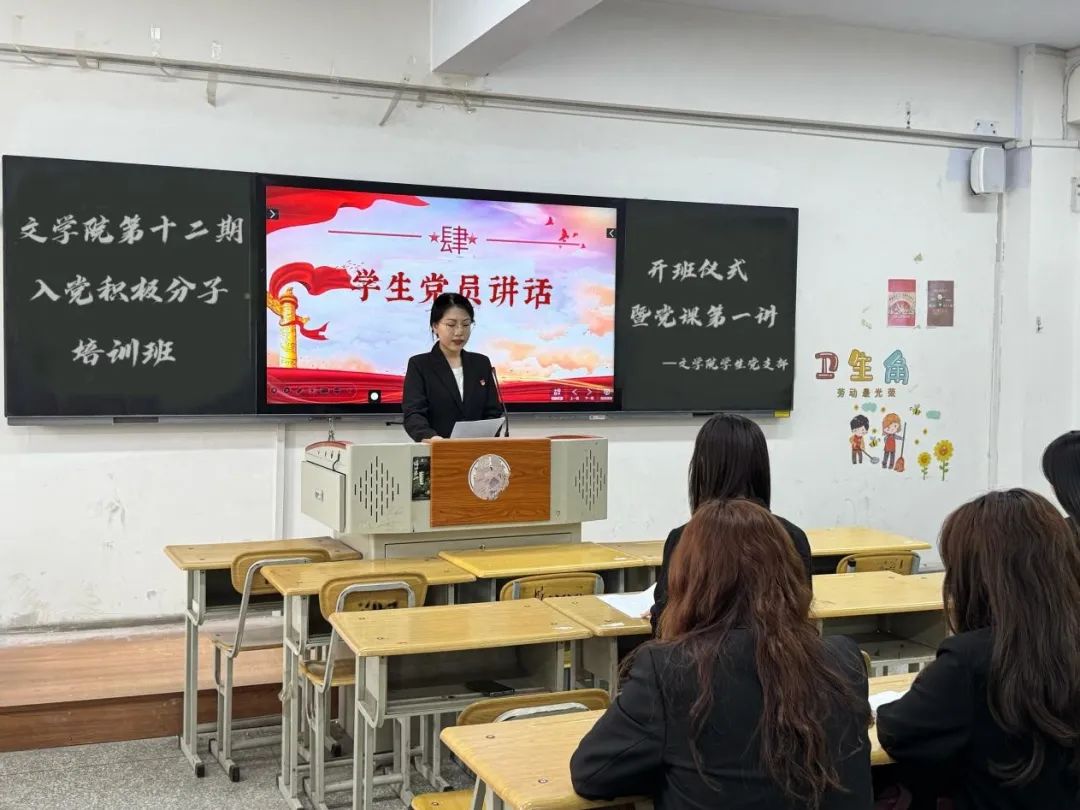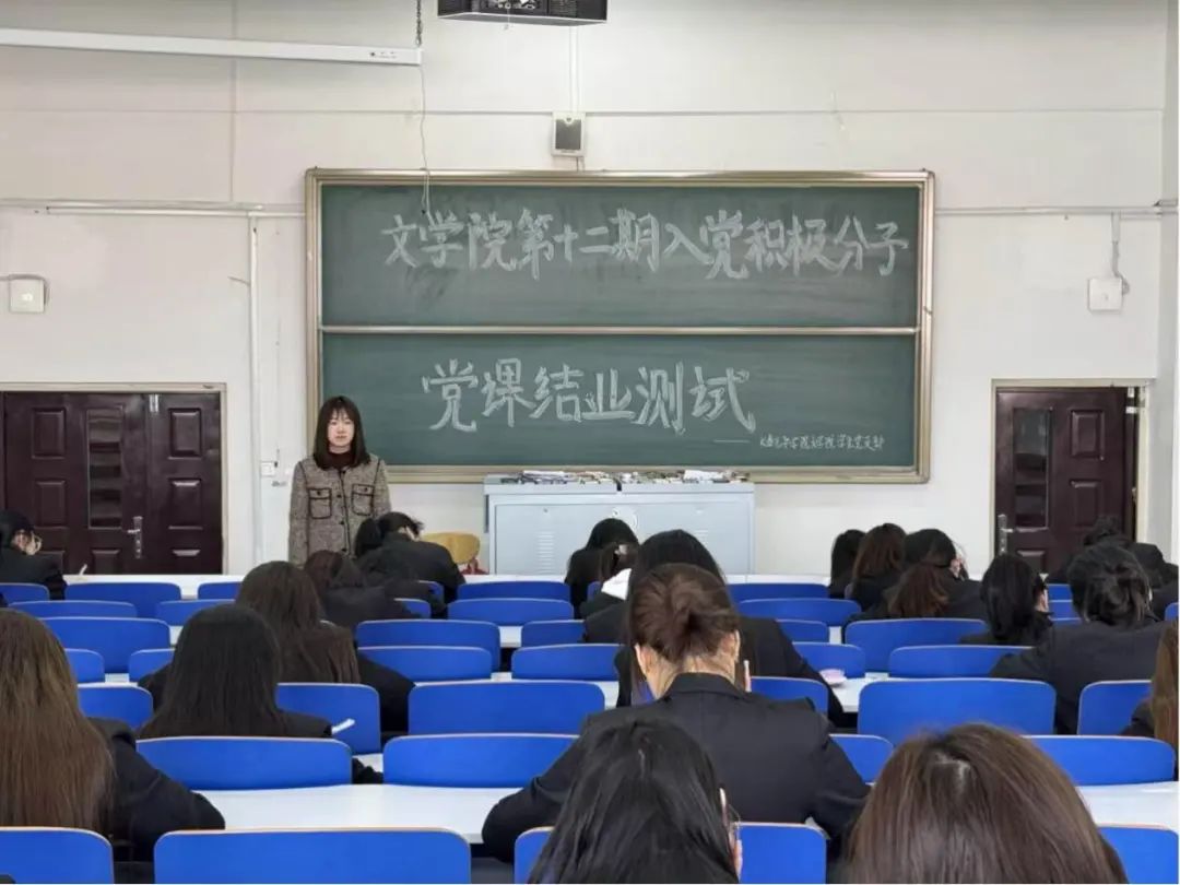 为加强入党积极分子的培养教育,切实提高入党积极分子的思想政治素质,端正入党动机,坚定理想信念,长春光华学院文学院学生党支部于2025年4月9日至4月21日召开第十二期入党积极分子党课培训班。开班仪式上,学生党支部书记吴晓曼对本期入党积极分子提出了明确要求和殷切期望,强调了党课培训的重要意义,鼓励学员们珍惜学习机会,以饱满的热情和严谨的态度参与培训,努力提升自身综合素质,积极向党组织靠拢。此次培训旨在通过系统的党课学习,使入党积极分子深入理解党的理论知识,提高政治素养,增强党性修养,为早日成为一名合格的共产党员奠定坚实基础。(供稿:文学院 初审:康爽 复审:赵闯 终审:杨鸿)