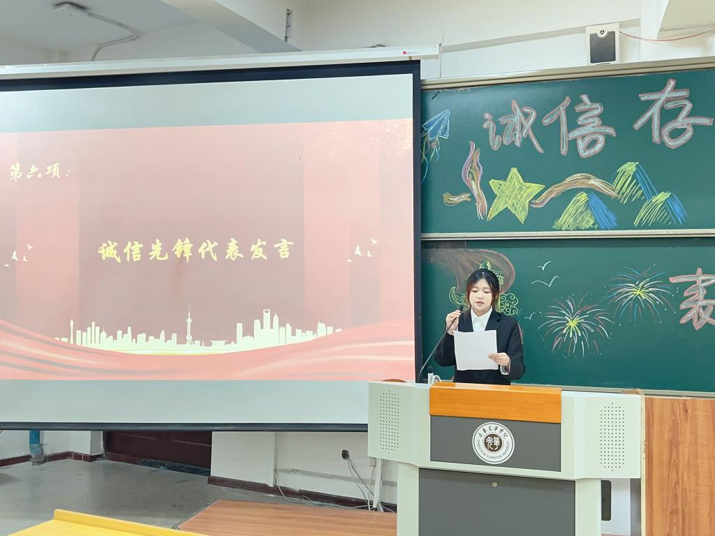 诚信先锋代表钟海荣同学发言,她表示,作为新青年学生,我们要肩负起时代赋予的崇高使命,要以钢铁般的意志守护诚信底线,争做诚信先锋,与时代同步伐、与祖国共命运、与人民齐奋斗。