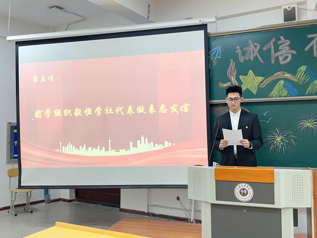 毅恒学社学生代表牛嘉博同学做表态发言,他表示,“诚信存折”活动不仅增强了同学们的集体荣誉感,而且也更加坚定了同学们立大志、明大德、成大才、担大任的决心。相信通过此次表彰大会,将树立起一面面鲜明的旗帜,激励同学们在未来的学习、工作和生活中,共同营造出一个勤勉好学、诚信待人、昂扬向上的新风气。