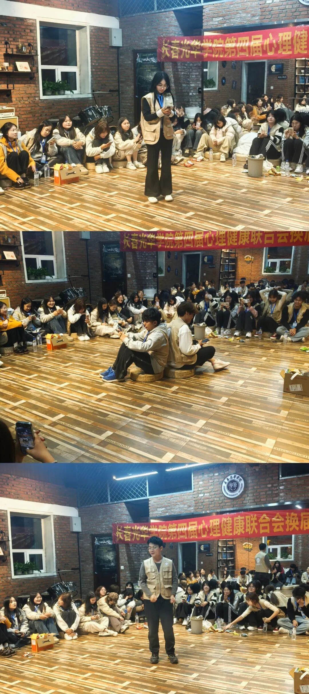 真正的重头戏是互动游戏环节!在宣传部部长付鑫宇同学的热情带领下,现场气氛瞬间被点燃。作为参加过吉林省高校朋辈心理委员胜任力示范培训和青春健康同伴教育主持人培训营的骨干,她将专业培训中学到的破冰技巧灵活运用到了现场。