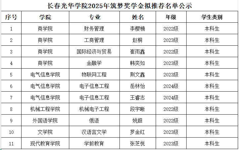 根据《关于开展2025年度吉林省筑梦奖学金评审工作的通知》文件要求,本着公平、公正、公开的原则,我校组织开展2025年筑梦奖学金评审工作,经学生申请、各教学院筑梦奖学金评审工作小组初审、学校评审委员会评审,拟推荐李樱楠等11名学生为我校2025年筑梦奖学金候选人。现将名单公示如下: