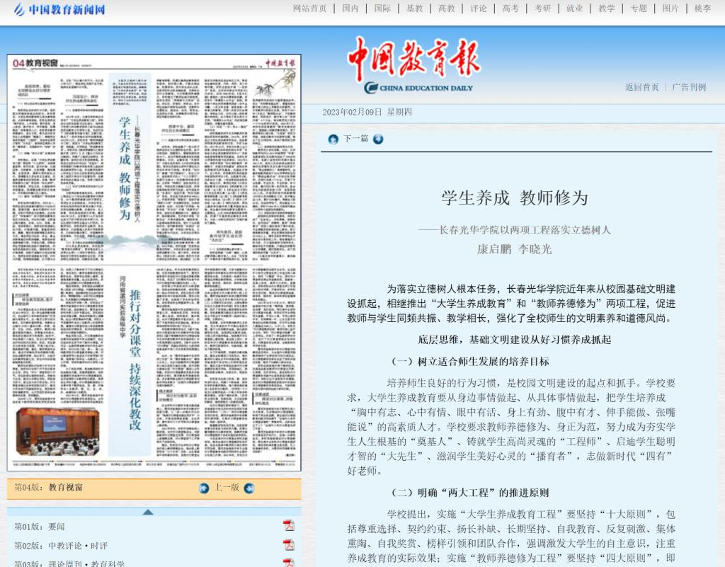 《中国教育报》|学生养成 教师修为——长春光华学院以两项工程落实立德树人